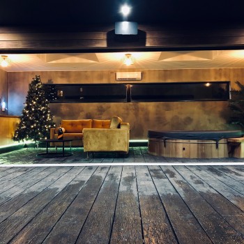 The full-width bi-fold doors are a standout feature, allowing the interior to merge with the outdoors seamlessly. When opened, they provide a perfect view of the stunning landscape while you relax in the wooden semi-recessed 10-man hot tub. We fabricated a birchwood ply kitchen, complete with a built-in fridge and dishwasher, ensuring functionality for this outdoor haven.
